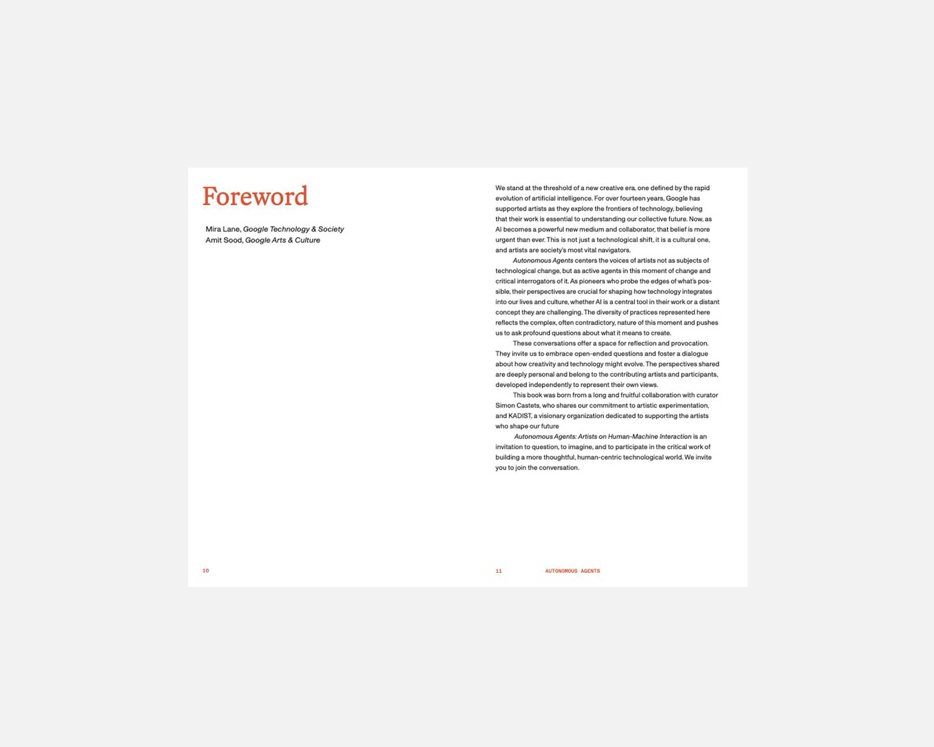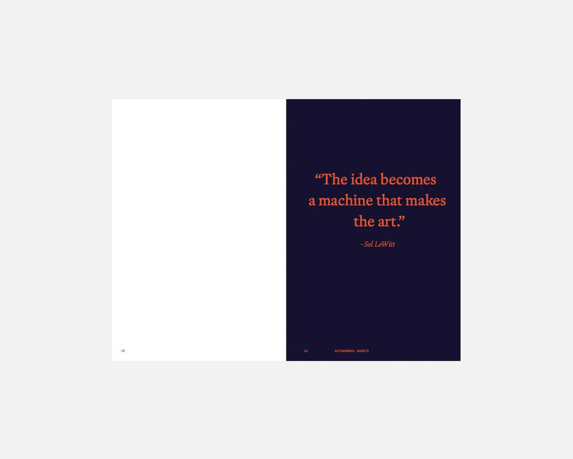 “The idea becomes a machine that makes the art.” This statement, made by Sol LeWitt in 1967, offers a link to the present moment. The porous boundaries between art and technology continue to evolve with the rapid pace of innovation and its social consequences. While machines’ ability to generate increasingly complex imagery has progressed exponentially over the past few years, the voices of artists often remain unnoticed in the unrelenting cacophony of novelty. Autonomous Agents: Artists on Human-Machine Interaction seeks to take stock of this vertiginous moment from their point of view. A collection of fifteen interviews, it features a wide geographical, philosophical, and generational array of practices by artists who engage with advanced technologies in meaningful, sometimes contradictory and critically challenging ways.